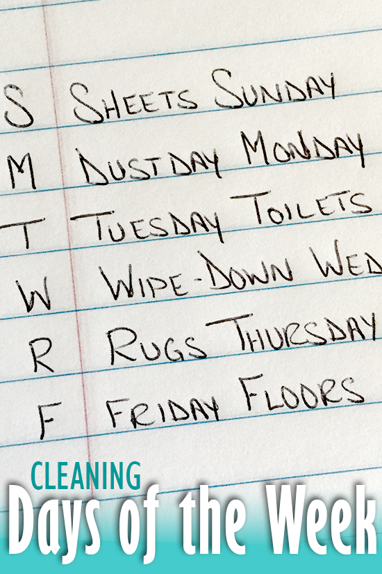 I've been working on that elusive stay-at-home/work-at-home balance. It's so easy for me to get tunnel vision on one task or activity and lose sight of the bigger picture. I've discovered I'll feel most accomplished if I set my three Most Important Tasks for the day to each pull from one category of need -- Home/Family, Self, and Blog. In the home/family category the easiest task to pull is the Day of the Week Clean.